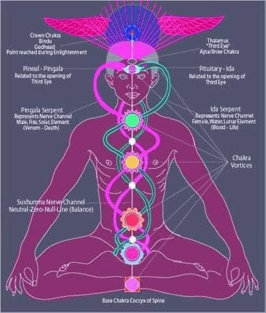Trong yoga, Kundalini (nghĩa là rắn quấn) là một dạng năng lượng chạy dọc theo cột sống mà trên đó có 07 luân xa (chakra – điểm thu phát năng lượng từ vũ trụ). Theo quan niệm này, trong mỗi con người đều có 1 con rắn đang ngủ và nếu đánh thức được con rắn này hay đánh thức được 7 luân xa này con người sẽ được giác ngộ và có quyền năng siêu phàm. Thiền sâu, niệm chú hay các động tác, tư thế trong yoga đều là để đánh thức con rắn này. Và đó chính là mục đích cuối cùng của yoga, cho dù hầu hết mọi người đến với yoga đơn giản chỉ là để cải thiện sức khỏe.