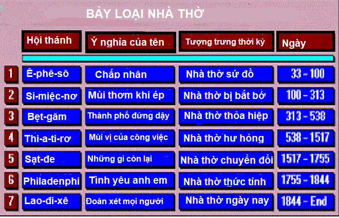 Sự xuất hiện của Thánh Linh của Đức Chúa Trời đã khởi động Bảy Thời Đại của Giáo Hội. Bảy thời đại của Nhà thờ được mô tả trong sơ đồ dưới đây.