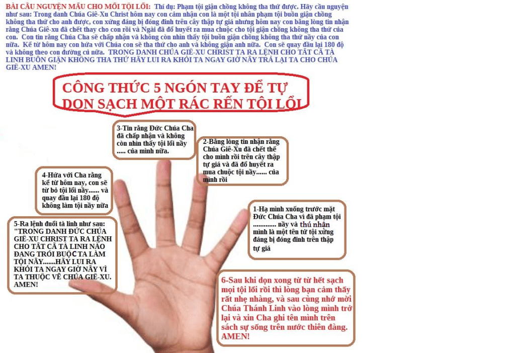 (Ghi chú: Có thể thực hiện thêm điều sau đây: sau khi xưng nhận tội lỗi và trục xuất tà linh uế linh gây ra tội lỗi đó, hãy cảm tạ Chúa về sự tha thứ của Ngài và nhơn danh Chúa Jesus tiếp nhận những điều tốt đẹp hơn từ Đức Thánh Linh.