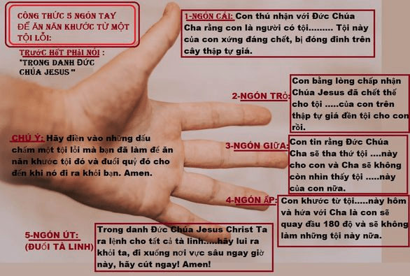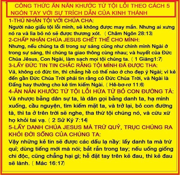 Ăn năn theo cách 5 ngón tay đã được Chúa Thánh Linh soi sáng cho admin vào năm 2015 bao gồm nền tảng về Tin Lành của nước Đức Chúa Trời và đã được áp dụng kết quả tốt đẹp. Người nào áp dụng đúng cách sẽ tự đuổi quỷ cho mình được mà không cần người nào khác đuổi quỷ cho mình. Mời các bạn hãy đọc, áp dụng và làm theo như trong 2 tấm hình dưới đây. Cách này đã được kiểm chứng bởi nhiều người đã áp dụng, làm theo, tự đuổi quỷ cho mình được kết quả tốt đẹp từ hơn 6 năm qua. Chúa yêu các bạn và muốn mỗi người chúng ta có tội biết ăn năn đúng cách, như cái phao mà chúng ta bám víu lấy nó để bơi lội được vào bến bờ tự do mà Chúa đã thương yêu đùm bọc chúng ta từ bao nhiêu năm nay. Ngài không muốn một người nào bị hư mất linh hồn mà Ngài muốn mọi người đều được cứu, được hưởng nước thiên đàng sau khi qua đời Amen!