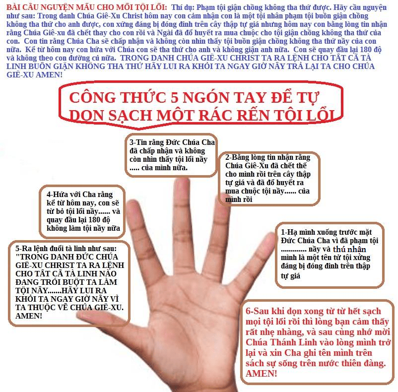 Ai cũng có thể đọc, tìm hiểu, ăn năn tội lỗi mình đã làm trong những năm qua và tự giải cứu mình tự đuổi quỷ cho mình sau khi ăn năn xong mỗi tội lỗi hầu ra khỏi sự làm nô lệ cho sa tan bằng cách ăn năn theo cách 5 NGÓN TAY đã được chỉ dẩn trong sách DỌN SACH LÒNG TRONG HÌNH TRÊN ĐÂY: