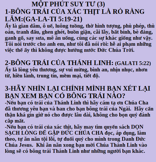 -Nếu bạn có trái của Thánh Linh thì hãy cảm tạ ơn Chúa Cha đã thương yêu bạn và ban cho bạn bông trái của Ngài. Hãy cẩn thận khá gìn giữ nó cho được lâu dài, không cho bọn quỷ đánh cắp mất.