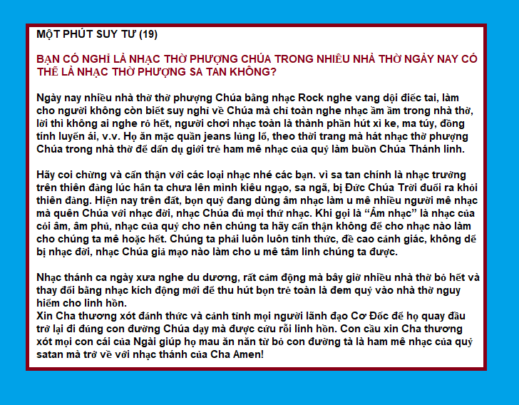 Xin Cha thương xót đánh thức và cảnh tỉnh mọi người lãnh đạo Cơ Đốc để họ quay đầu trở lại đi đúng con đường Chúa dạy mà được cứu rỗi linh hồn. Con cầu xin Cha thương xót mọi con cái của Ngài giúp họ mau ăn năn từ bỏ con đường tà là ham mê nhạc của quỷ satan mà trở về với nhạc thánh của Cha Amen!