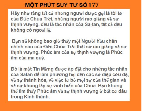 Bạn sẽ không bao giờ thấy một người hầu chân chính nào của Đức Chúa Trời thật sự rao giảng về sự thạnh vượng. Phúc âm của sự thịnh vượng là phúc âm của ma quỷ.
