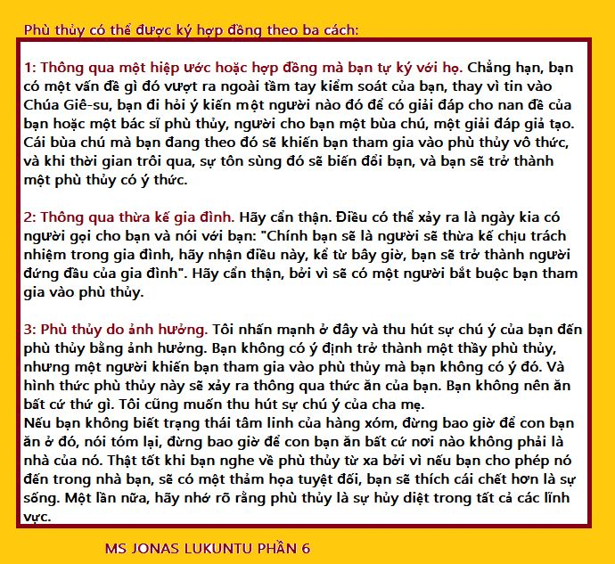 1: Thông qua một hiệp ước hoặc hợp đồng mà bạn tự ký với họ. Chẳng hạn, bạn có một vấn đề vượt ra ngoài tầm tay bạn, thay vì tin vào Chúa Giê-su, bạn đi hỏi ý kiến một người để xoa dịu bạn hoặc một bác sĩ phù thủy, người cho bạn một bùa chú, một giải đáo giả tạo. Cái bùa chú mà bạn đang theo đó sẽ khiến bạn tham gia vào phù thủy vô thức, và khi thời gian trôi qua, sự tôn sùng đó sẽ biến đổi bạn, và bạn sẽ trở thành một phù thủy có ý thức.