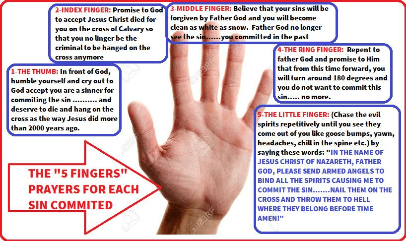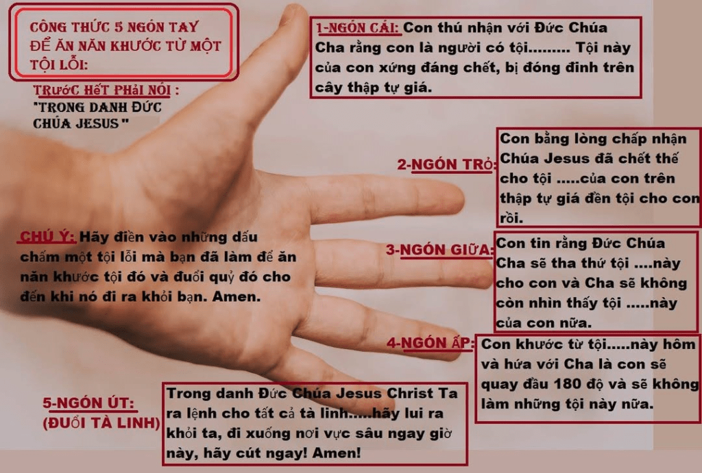 Thành phần bị quỷ ám ít hay nhiều thì chúng ta nên giúp cho họ biết tự ăn năn tội lỗi của mình và tự đuổi quỷ cho mình theo cách 5 ngón tay kết quả tốt (kèm theo trong hình cách ăn năn khước từ đuổi quỷ 5 ngón tay bằng tiếng anh và tiếng Việt). Những tội lỗi mà bọn quỷ được phép đến phá phách ám ảnh họ cho họ bị ảo giác thường là những tội nặng có liên quan đến việc tìm kiếm phù thủy và cho phép chúng nó vào phá chúng ta. Nếu họ đi tìm người giúp đuổi quỷ cho họ được xong nhưng tội lỗi họ vẫn còn đó, bọn quỷ sẽ không sớm thì muộn kéo nhau trở lại đánh phá lần nữa nhưng nhiều hơn gấp 7 lần. Tình trạng sau nầy sẽ tệ hơn lần đầu gấp 8 lần. Cho nên chúng ta không nên đuổi quỷ cho ai mà không giúp họ trước cách ăn năn khước từ tội lỗi và tự đuổi quỷ cho mình theo cách 5 ngón tay mà Thánh Linh có chỉ dạy cho tôi.