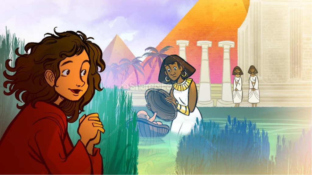 Bà bảo đứa con gái, là Mi-ri-am, chị của Môi-se, đi theo rương sậy, nhìn xem công chúa đi ra. Đúng như Đức Chúa Trời đã định, công chúa thấy đứa trẻ quá đẹp đẽ, một đứa con trai ngây thơ, xinh xắn. Công chúa động lòng.