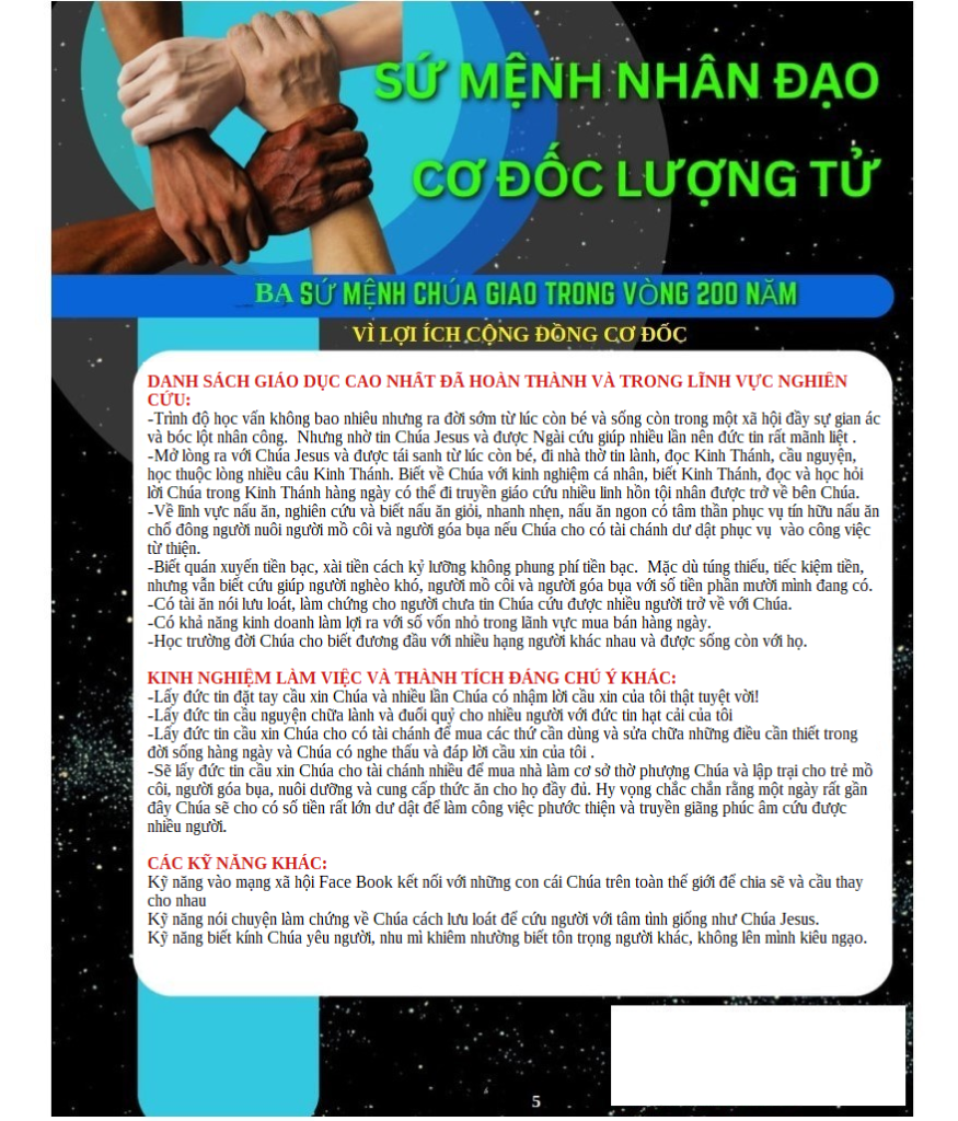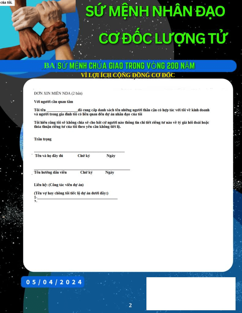 TIN GIỜ CHÓT: TÀI LIỆU 6 TRANG DƯỚI ĐÂY BẠN NÊN IN RA 1-3 BẢN MÀU. GIỬ 1 BẢN VÀ NỘP 2 BẢN KHI CÓ 2 NGƯỜI PHỎNG VẤN BẠN. NÊN IN 3 BẢN VÌ TÙY THEO NƠI HỌ MUỐN CÓ 2 BẢN CHO NÊN TỐT HƠN IN RA 3 BẢN. LÀM 3 CÁI CẶP CHO 2 NGƯỜI PHỎNG VẤN BẠN VÀ 1 CÁI CHO BẠN. NHỚ NÓI NGƯỜI PHỎNG VẤN BẠN KÝ TÊN VÀO MỖI BẢN VÀ BẢN BẠN GIỬ CŨNG PHẢI CÓ NGƯỜI PHỎNG VẤN KÝ TÊN LUÔN. NẾU TRƯỜNG HỢP BẠN CÓ BỆNH THÌ NHỜ HỌ LÀM APPOINTMENT CHO NẰM MED BED SỚM ĐỂ TRỊ BỆNH. NẾU HỌ CÓ HỎI CHƯƠNG TRÌNH THIỆN NGUYỆN CỦA BẠN ƯỚC TÍNH TỐN BAO NHIÊU TIỀN? TÙY THEO BẠN. TÔI PHỎNG ĐOÁN HÀNG TRĂM TRIỆU ĐÔ LA HOẶC HƠN NỮA TÙY THEO CÔNG SỨC CỦA BẠN MUỐN LÀM NHIỀU HAY ÍT MÀ XIN VÀ HỨA VỚI CHÚA THÔI. HỌ SẼ CHO BẠN 1% SỐ TIỀN BẠN NHẬN ĐƯỢC VÀ XEM XÉT BẠN TRONG VÒNG 6 THÁNG ĐẦU XEM BẠN LÀM GÌ VÀ CHI VÀO ĐÂU. NẾU BẠN CHO VÀ RƯỢU CHÈ, BÀI BẠC, HÚT SÁCH THÌ HỌ SẼ LẤY HẾT LẠI NGAY.